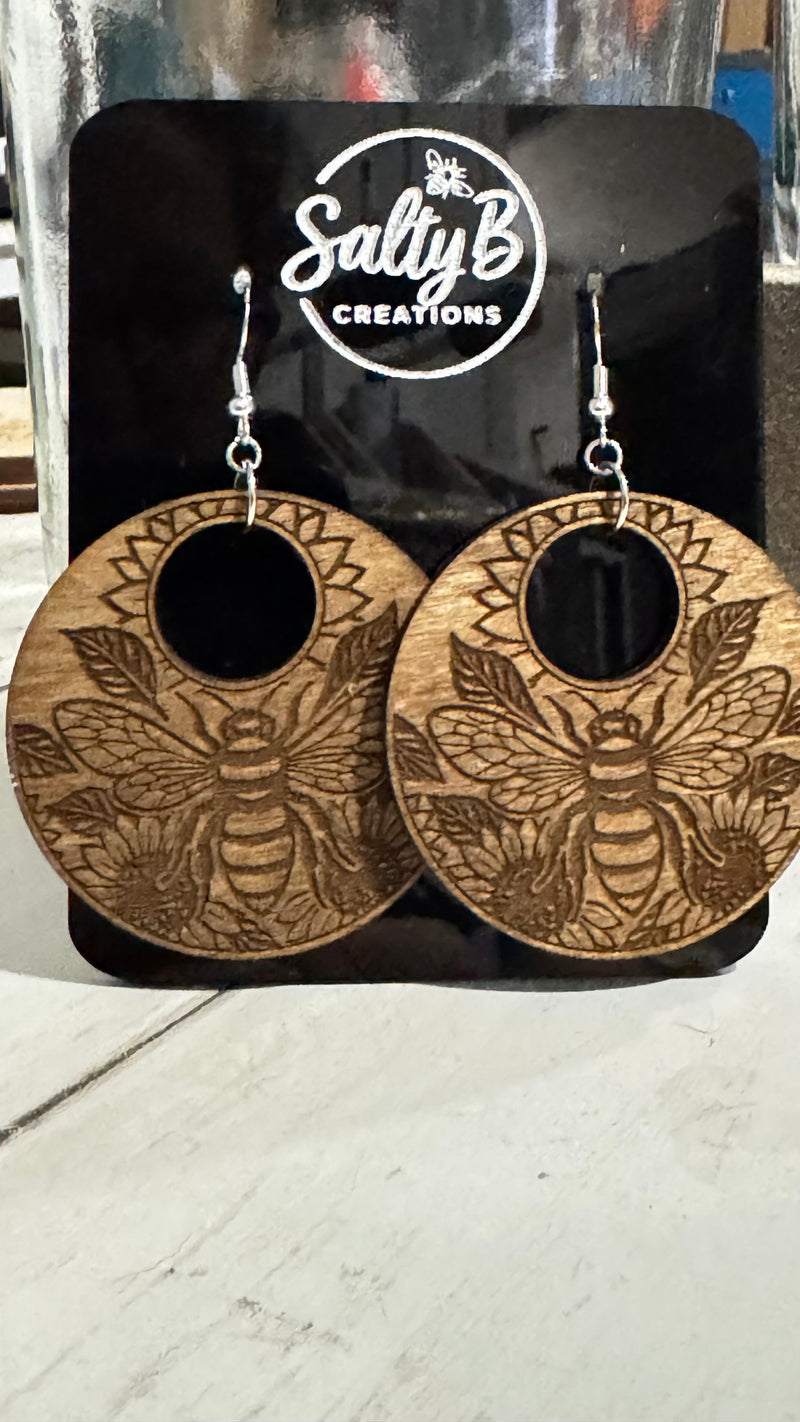 Honeybee Grove Earrings – Engraved Wooden Circle Dangles